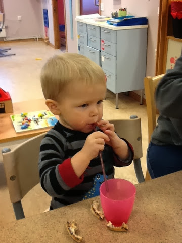 Idag festar vi till det på mellanmålet! Vi dricker saft (lättdryck) till smörgåsen. Och vi dricker självklart med sugrör... Vi tränar också på att smöra våra smörgåsar själva!